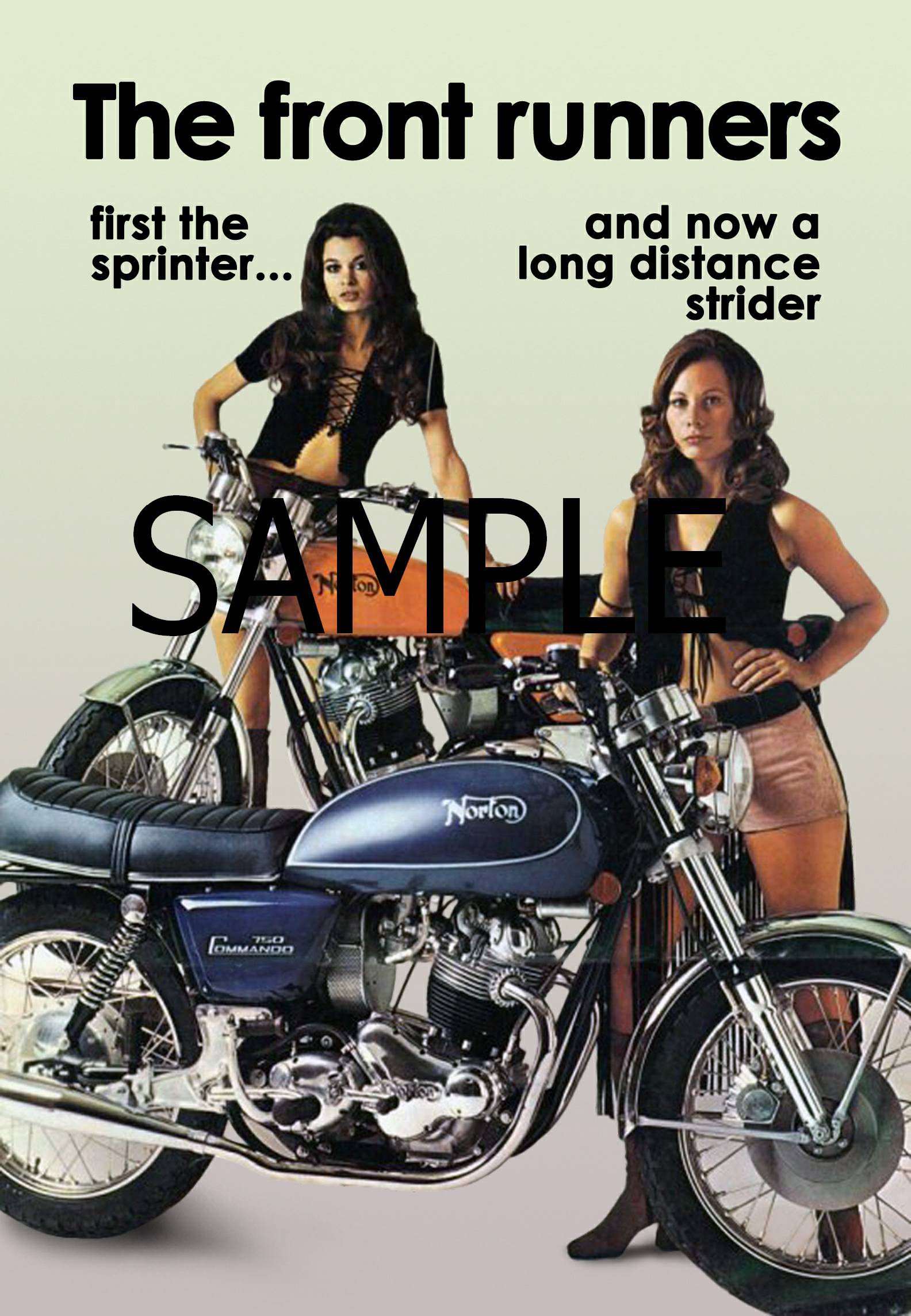 "Norton Girl" Posters are printed on standard paper stock, suitable for display in your den or garage. These are digitally remastered versions of classic Norton ads, scaled to fit standard 11" x 14" frames. Click on the small photo to see a larger version. Although some text may look blurred in these photos, it is all quite clear in the actual product.